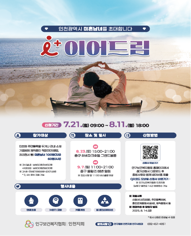 - 2회 참가자 총 50쌍 중 25쌍 커플 탄생, 커플 매칭률 50% 기록 - [인천 세계타임즈=심하린 기자] 인천광역시(시장 유정복)와 인구보건복지협회 인천지회(회장 박규홍)는 청년 미혼남녀의 건전한 만남을 지원하는 ‘아이플러스(i+) 이어드림’ 참가자를 오는 7월 21일부터 8월 11일까지 3주간 모집한다고 밝혔다.