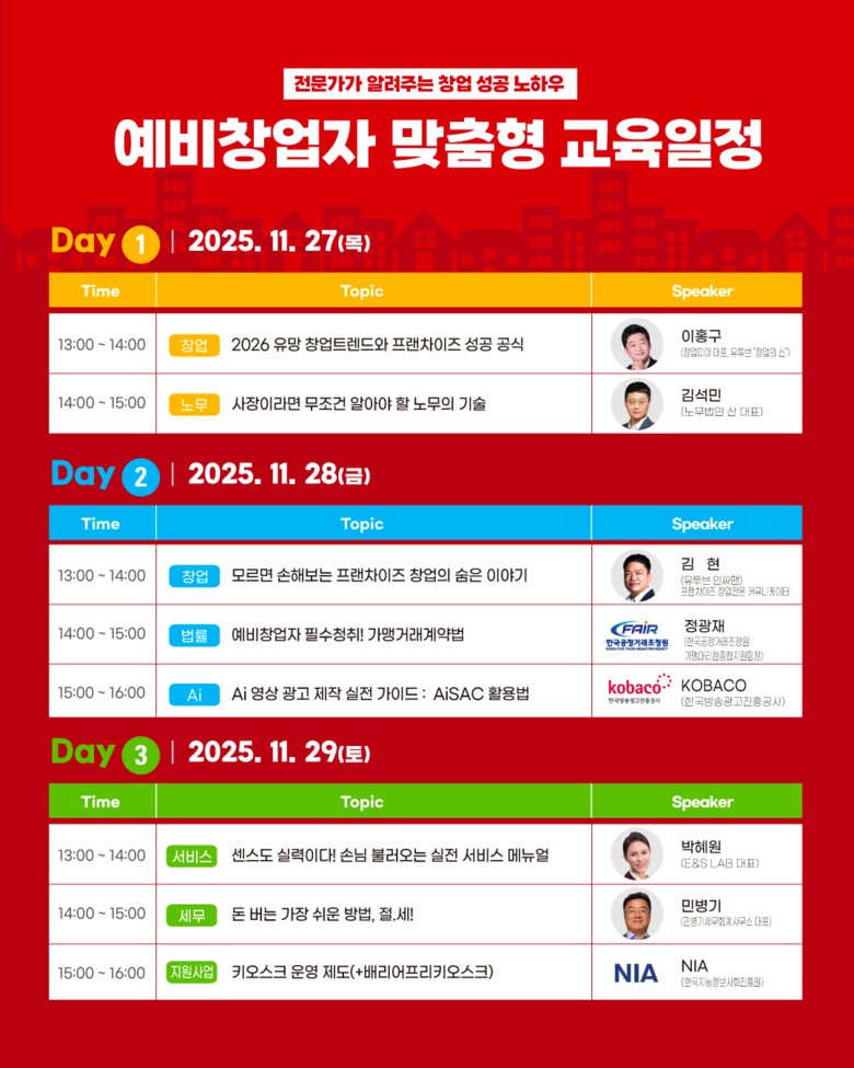 둘째 날인 28일에는 ▲김현 유튜브 채널 ‘인싸맨’ 대표가 ‘모르면 손해보는 프랜차이즈 창업의 숨은 이야기’ ▲정광재 한국공정거래조정원 팀장의 ‘예비창업자 필수청취! 가맹거래계약법’ ▲한국방송광고진흥공사에서는 ‘에이아이(AI) 영상 광고 제작 실전 가이드 : 아이작(AiSAC) 활용법’을 주제로 특강을 진행한다.