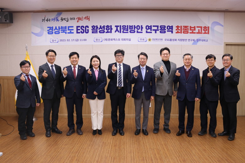 최종보고회를 끝으로 공식적인 활동을 마감하는 ‘경상북도 ESG활성화 지원방안 연구회’는 경상북도 내 지역 현안 연구를 위한 경상북도의회 의원연구단체로 연규식(포항4), 배진석(경주1), 서석영(포항6), 이동업(포항7), 정경민(비례), 차주식(경산1), 최덕규(경주2) 의원 등 6명으로 구성되었으며, 경상북도의 ESG활성화를 위한 정책과 대안 마련을 위해 열정적인 활동을 펼쳐왔다.