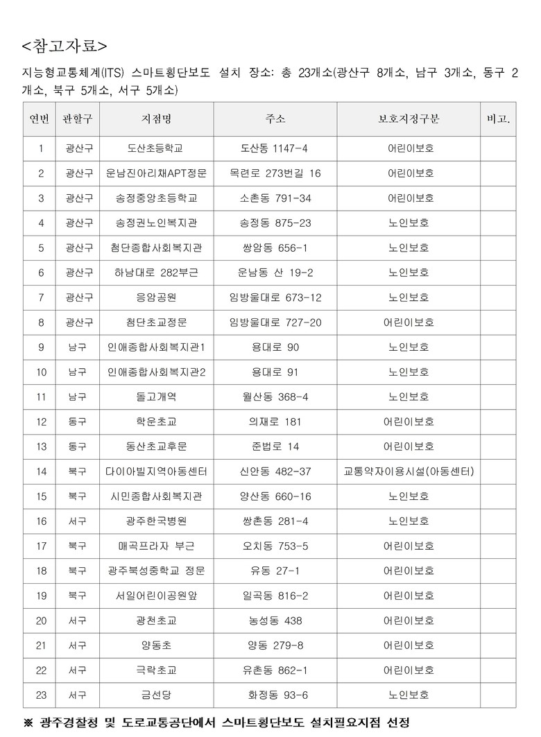 이는 국토교통부 ‘지능형교통체계(ITS) 구축 공모’에 광주시가 선정돼 총 사업비 약 19억원을 투입, 노인·어린이 교통사고 위험지역 23개소에 구축했다.