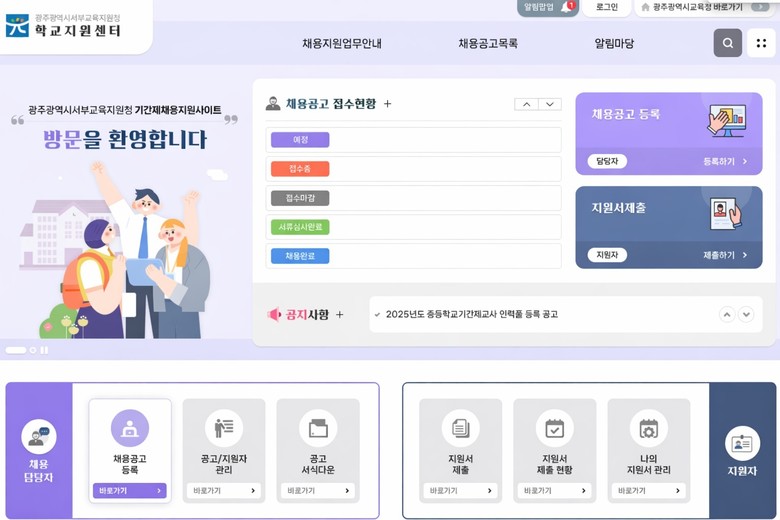 광주서부교육지원청은 각 학교의 ▲채용 공고 ▲서류 접수 및 심사 ▲합격자 서류 학교 이송 등을 지원해 원활한 채용이 이뤄지고 인사행정의 공정성도 확보할 계획이다.