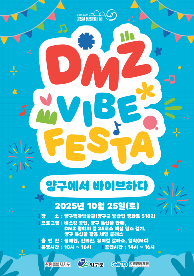 접경지역 순회 행사는 양구에 이어 11월 8일 인제에서 계속된다. 자세한 내용은 누리집(https://dmzvibefesta.kr/)에서 확인할 수 있다.
