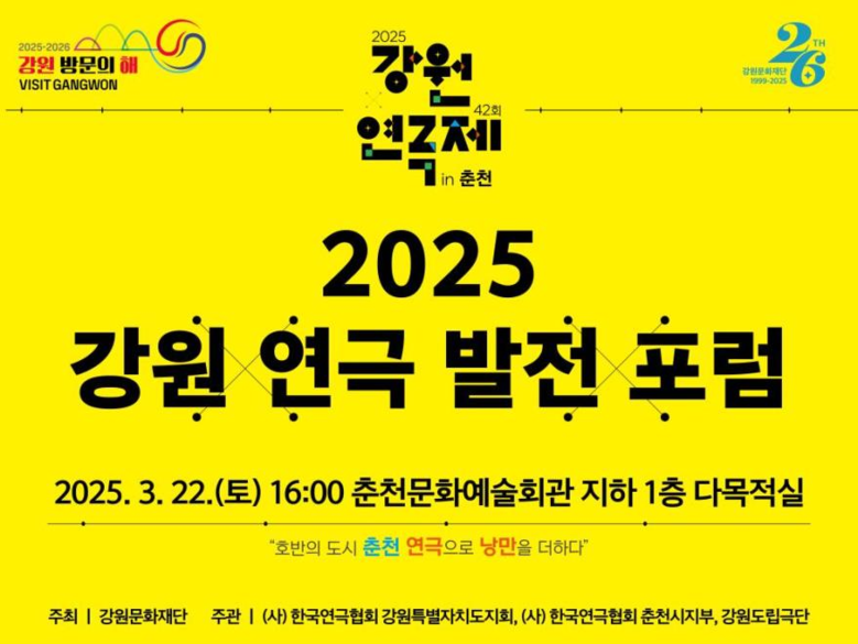 ・3월 22일(토) 오후 4시 춘천문화예술회관 지하 1층 다목적실에서 개최 [강원도 세계타임즈=김민석 기자] 강원문화재단(대표이사 신현상)은 「2025-2026 강원 방문의 해」와 제42회 강원연극제를 맞아 오는 3월 22일(토) 오후 4시에 춘천문화예술회관 지하 1층 다목적실에서 <2025 강원 연극 발전 포럼>을 개최한다고 밝혔다.