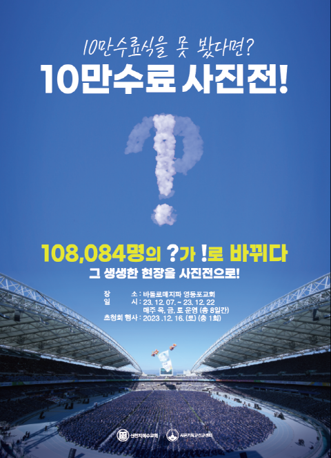 신천지예수교회 바돌로매지파 영등포교회(지파장 곽종렬, 바돌로매지파 영등포교회)는 "신천지예수교회가 2019년, 2022년에 이어 세 번째 10만 명 이상 수료생을 배출했다. 현장에 함께하지 못한 시민들을 위해 사진전을 준비했다"고 전했다.