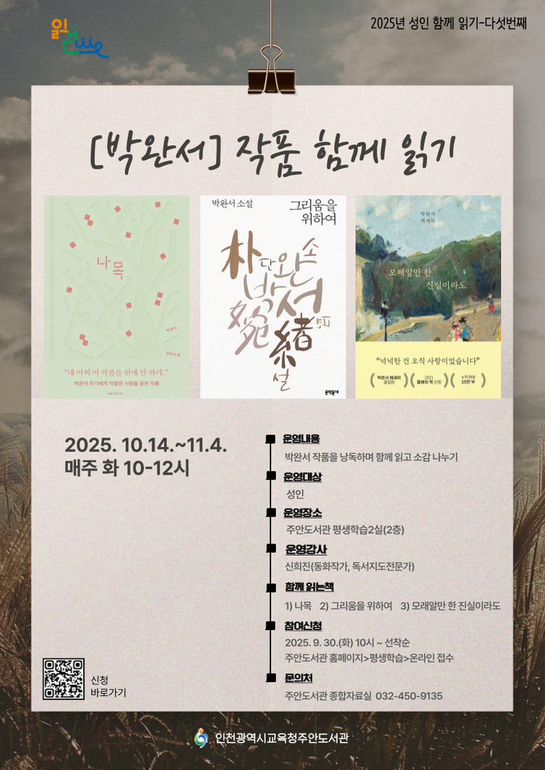 참여 신청은 9월 30일 오전 10시부터 주안도서관 누리집에서 가능하며, 자세한 사항은 주안도서관 누리집(https://lib.ice.go.kr/juan) 또는 종합자료실(032-450-9135)로 문의하면 된다.