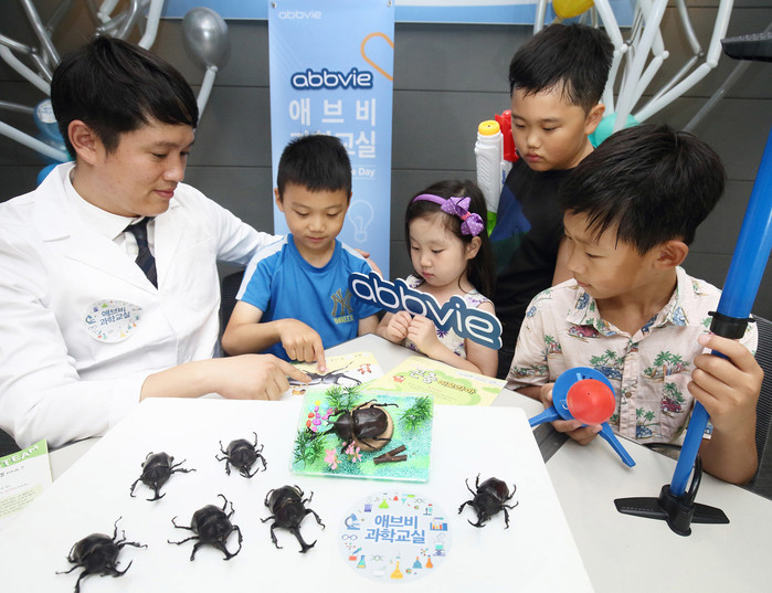 | ▲한국애브비는 임직원 자녀 30여 명을 본사로 초청해 장수풍뎅이 서식처 탐구 및 디오라마 만들기와 아이스쿨팩, 에어로켓 등을 만들어보는 시간을 가졌다. |