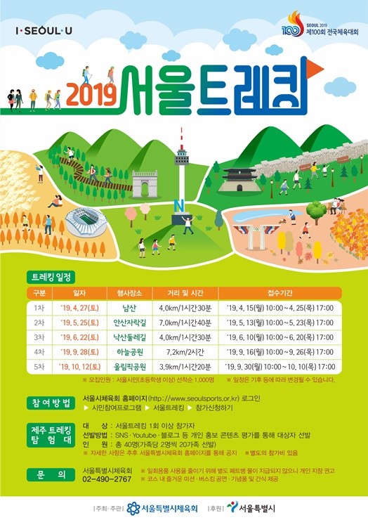 2019 서울트레킹은 지난 4월 27일(토) 남산을 시작으로 진행됐으며 상·하반기 총 5차례에 걸쳐 운영될 계획이다. ▲낙산공원 둘레길(6월 22일), 하반기에는 ▲하늘공원(9월 28일), ▲올림픽공원(10월 12일) 코스로 운영될 예정이며 일정은 상황에 따라 변경될 수 있다.