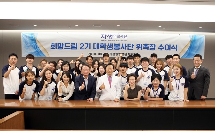 ‘자생의료재단 희망드림 봉사단’은 대학생들에게 자원봉사 참여기회를 제공하고, 자생의료재단의 의료 인프라를 봉사활동과 연계하여 지역 사회 발전에 이바지하고자 시작됐다. 지난 2016년 봉사단 1기가 1년간의 활동을 마쳤으며 올해 2기가 새로 조직되어 공헌 활동을 이어나가게 된다.