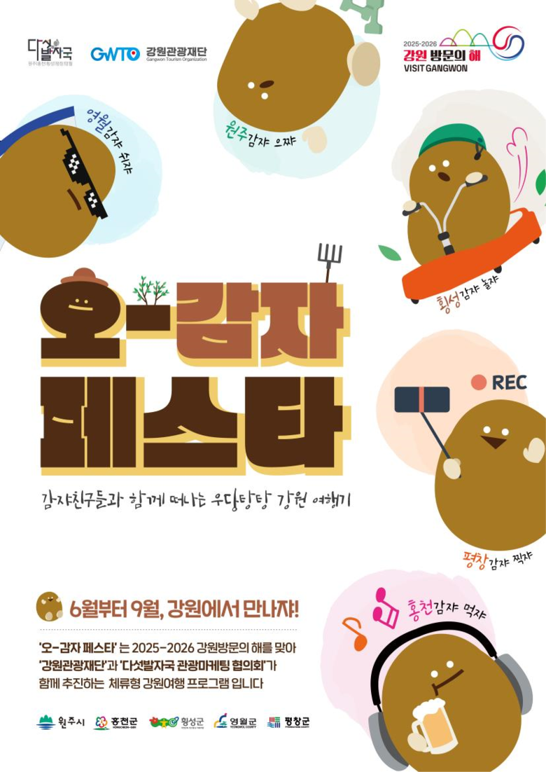 이번 ‘오감자 페스타’는 이름처럼 강원 ‘다섯발자국’을 찾는 여행객들의 ‘오감(五感)’을 만족시키는 데 초점을 맞춘다. 각 시군의 특색 있는 전통시장 먹거리와 아름다운 자연 속 치유형 체험시설을 엮어 당일치기 또는 1박 체류형 테마 여행으로 강원 방문객들의 마음을 사로잡을 계획이다. 6월부터 9월까지 펼쳐지는 각 시군별 테마 여행은 다음과 같다.