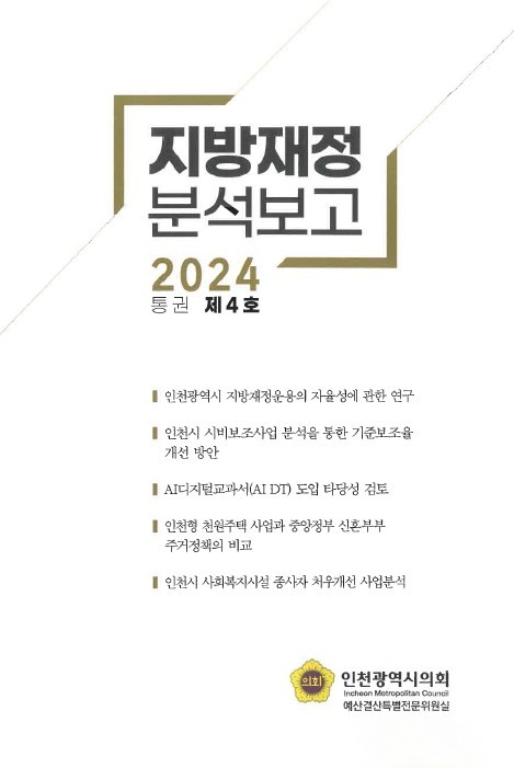 예결전문위원실은 인천시 지방재정의 분석을 통한 예산 운영의 효율성과 계획성을 제고하고자 매년 지방재정 분석보고서를 제작 배부하고 있다.