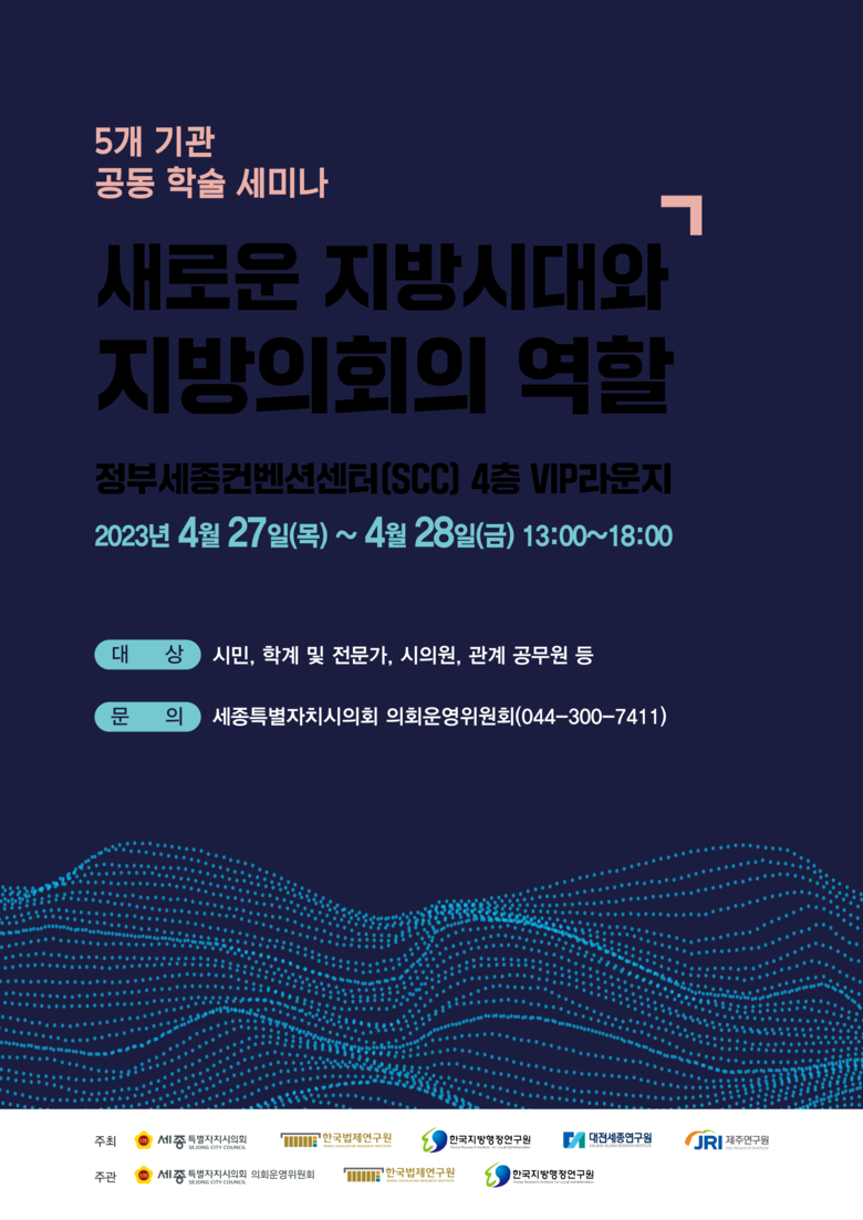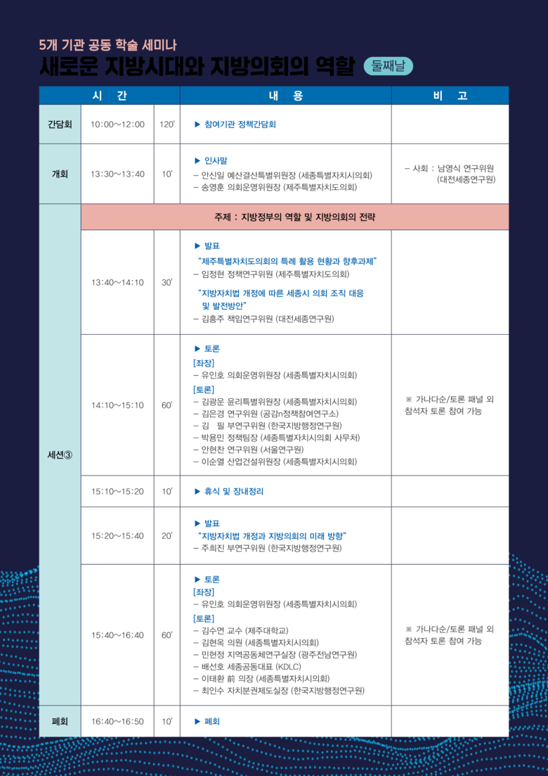 세미나는 세종시의회 의회운영위원회(위원장 유인호)와 함께 한국법제연구원, 한국지방행정연구원, 대전세종연구원, 제주연구원 등 5개 기관의 공동주최로 정부세종컨벤션센터 VIP 라운지에서 개회식을 시작으로 총 3개 세션으로 나누어 기조 발제 후 토론 순으로 진행된다.