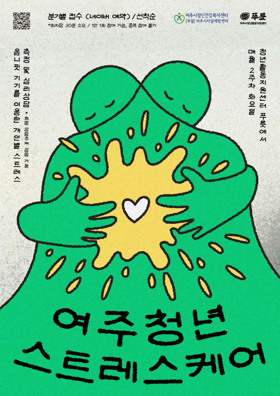 한 번에 가능한 여·스·케와 함께해요! [여주시 세계타임즈=송민수 기자] 여주시청년활동지원센터 푸릇(이하 푸릇)은 오는 3월부터, 여주시정신건강복지센터와 함께하는 협력사업으로「여주 청년 스트레스 케어(이하 여·스·케)」프로그램을 진행한다고 밝혔다.