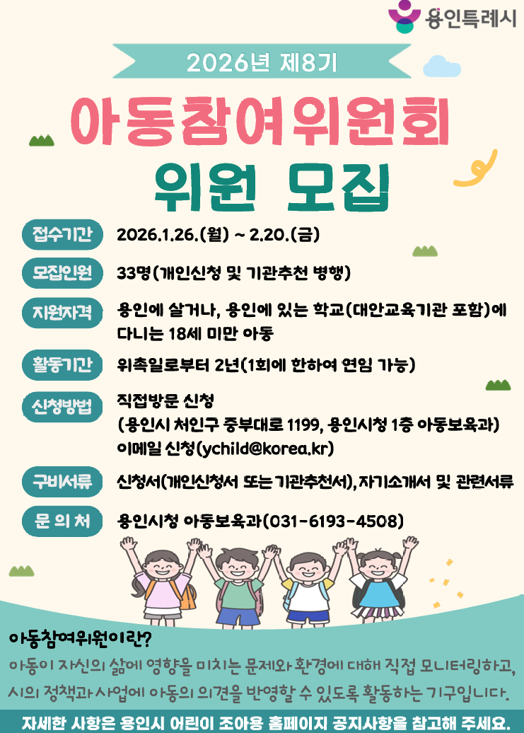 시 관계자는 “아동참여위원회는 지역의 아동 눈높이에 맞는 정책을 만들고 제안하는 중요한 역할을 담당하고 있다”며 “아동의 권리 증진과 보호에 관심 있는 아동들의 관심과 참여를 바란다”고 말했다.