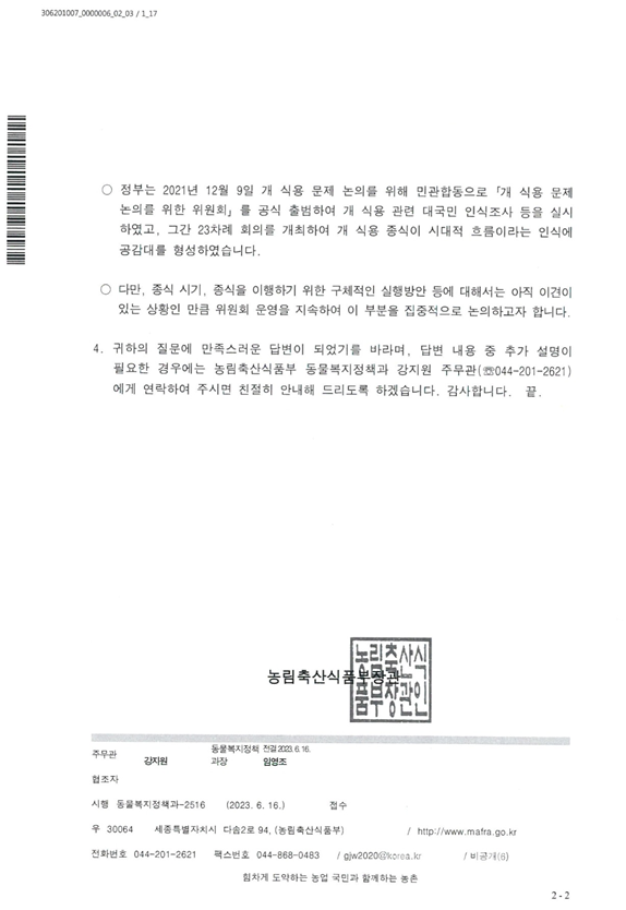 농림축산식품부는 육견 관련단체의 개도축 문제에 대하여 정식으로 서면 답변/제공=전국육견상인회