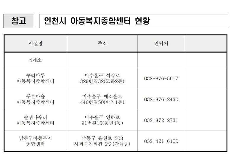 상담은 인천시 아동복지종합센터 4개소(누리마루, 푸른마을, 솔샘누리, 남동구 아동복지종합센터)에서 진행되며, 총 100명을 대상으로 예산 소진 시까지 운영된다.