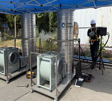| ▲ [민간 측정대행업체 정기숙련도 평가 참여 사진] ※ 장소: 인천보건환경연구원 별관 모형 굴뚝 |