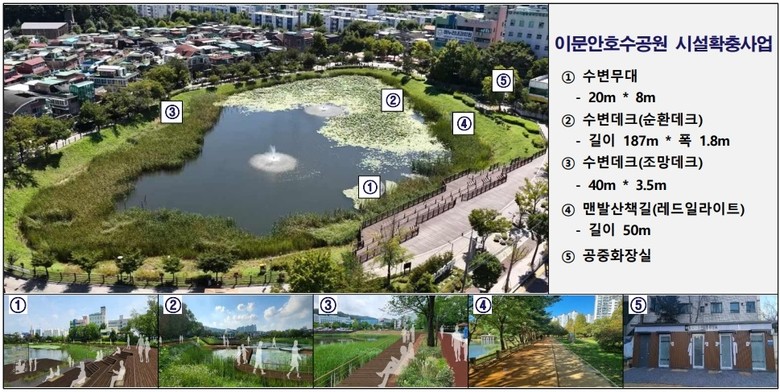 이번 사업은 이문안호수공원의 수변 공간을 중심으로 수변무대와 수변나무 바닥(데크), 맨발 산책길, 공중화장실 등 주민 설문조사를 통해 이용 수요가 높은 시설을 조성하고, 건강·여가·문화 기능을 동시에 강화하는 데 목적을 두고 있다.