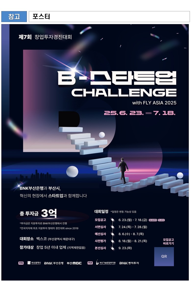 ◈ 관심 있는 기업은 오는 7.18.까지 부산창업포털(www.busanstartup.kr)을 통해 온라인으로 신청하면 돼 [부산 세계타임즈=이용우 기자] 부산시(시장 박형준)는 「제7회「비(B)-스타트업 챌린지(창업투자경진대회)」를 오는 9월 23일 벡스코에서 개최한다고 밝혔다.