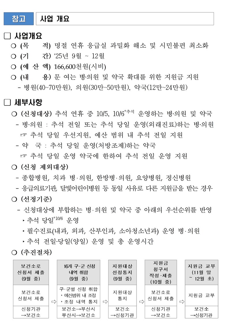 ○ [병의원] 추석 전일(10월 5일) 또는 추석 당일(10월 6일) 운영하는 병의원을 대상으로 한다.