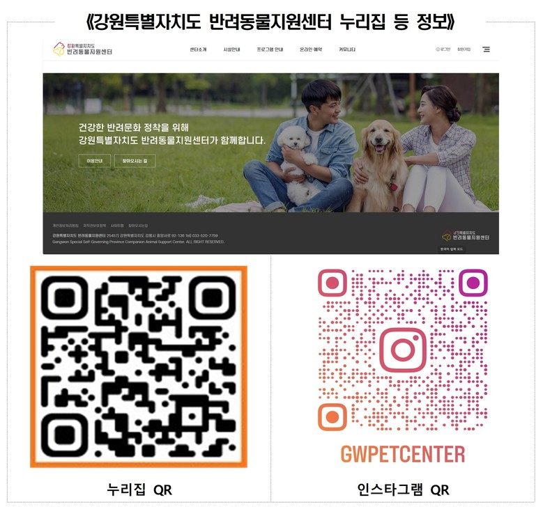 또한 누리집 구축과 더불어 사회관계망 채널(인스타그램 @gwpetcenter)도 함께 운영하며, 방문 반려견 사진과 시설 이용 방법 등 다양한 정보를 제공해 방문객과의 소통을 강화하고 있다.