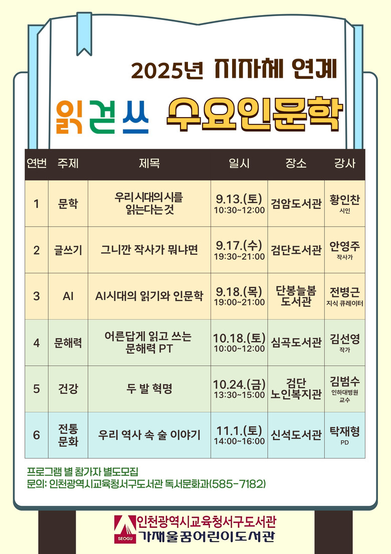 강연은 검암도서관, 단봉늘봄도서관, 검단도서관, 심곡도서관, 신석도서관, 검단노인복지관 등에서 분야별 전문가와 함께 진행한다.