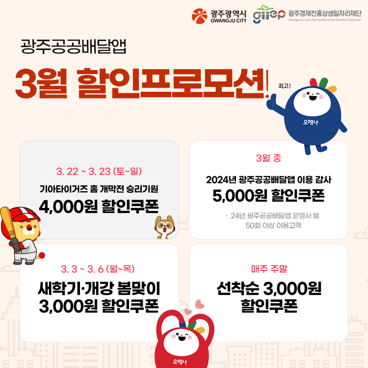 우선 새학기를 맞이해 평일인 3월 3일부터 6일까지 3000원 할인쿠폰을 제공한다. 매주 토‧일요일 제공하는 3000원 주말 할인쿠폰 혜택도 이어가고, 특히 KIA 타이거즈 홈 개막전 기간인 3월 22일과 23일에는 타이거즈의 승리를 기원하며 최대 4000원까지 할인쿠폰을 제공한다.