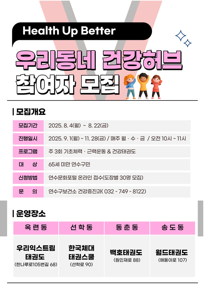 ‘우리 동네 건강허브(H.U.B)’ 프로그램은 연수구 태권도협회와의 함께 지역 내 태권도장을 대상으로 진행하며, 하반기에는 4곳을 지정해 운영한다.