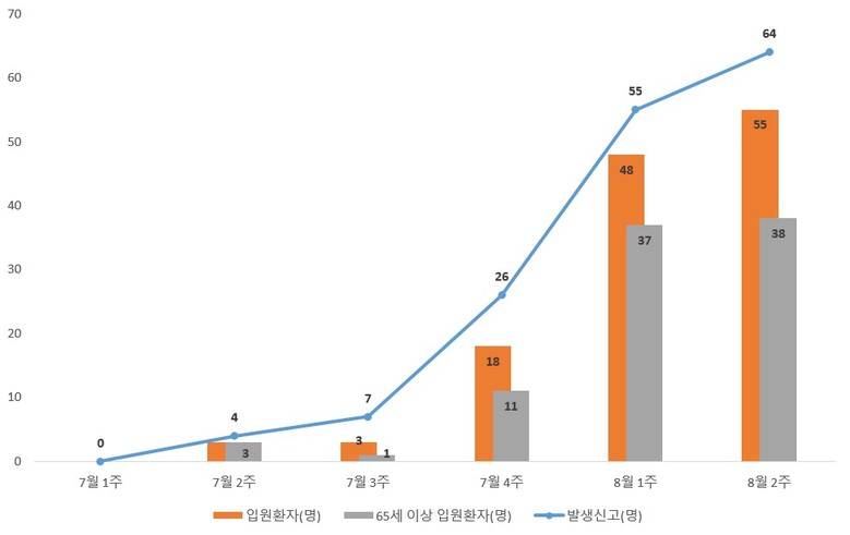 광주지역 200병상 병원급 표본감시기관(5개소)의 8월 2주 입원환자는 55명으로, 4주전 3명에 비해 18배 늘었다.