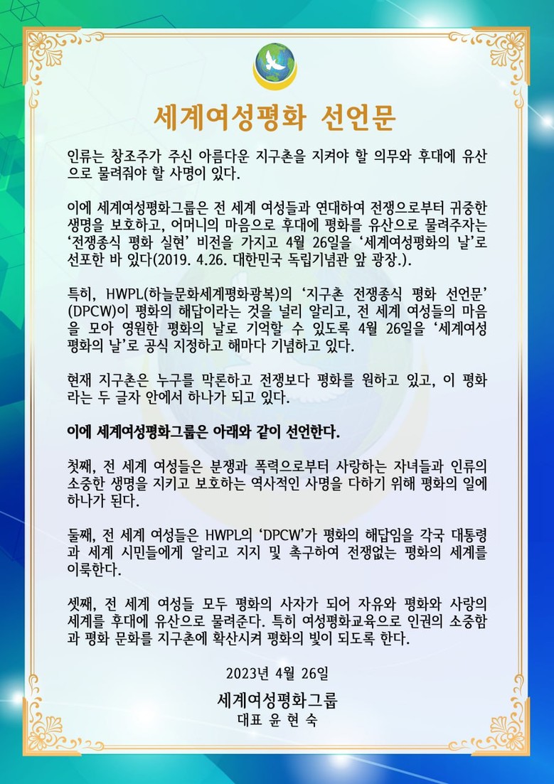 또한 윤현숙 대표는 ‘세계여성평화 선언문’을 발표했다. 첫째, 전 세계 여성들은 분쟁과 폭력으로부터 사랑하는 자녀들과 인류의 소중한 생명을 지키고 보호하는 역사적인 사명을 다하기 위해 평화의 일에 하나가 된다. 둘째, 전 세계 여성들은 HWPL의 ‘DPCW’가 평화의 해답임을 각국 대통령과 세계 시민들에게 알리고 지지 및 촉구하여 전쟁없는 평화의 세계를 이룩한다. 셋째, 전 세계 여성들 모두 평화의 사자가 되어 자유와 평화와 사랑의 세계를 후대에 유산으로 물려준다. 특히 여성평화교육으로 인권의 소중함과 평화 문화를 지구촌에 확산시켜 평화의 빛이 되도록 한다.