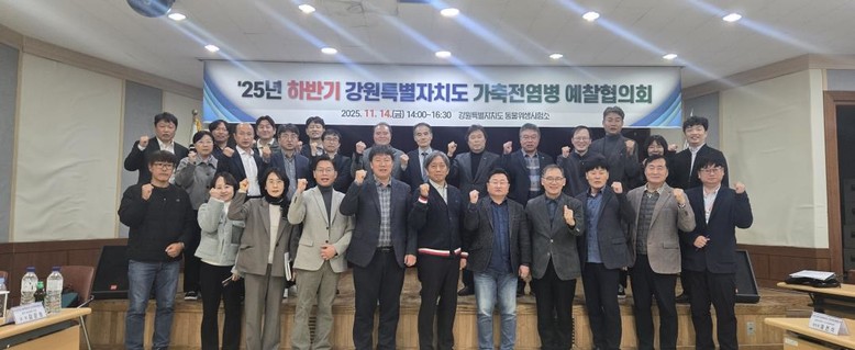[강원도 세계타임즈=김민석 기자] 강원특별자치도(도지사 김진태) 동물위생시험소는 11월 14일(금) ‘2025년 하반기 강원특별자치도 가축전염병 예찰협의회’를 개최했다고 밝혔다.