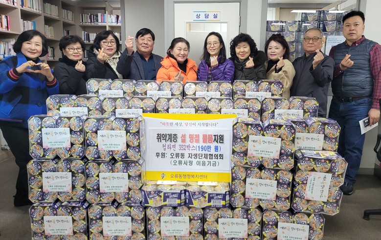 [중구 세계타임즈=이채봉 기자] 대전 중구 오류동(동장 조명화)은 지난 30일 설 명절을 맞아 오류동 자생단체 및 주민들이 ‘오류사랑 이음기금’으로 마련한 컵라면 352박스(190만 원 상당)를 저소득 어려운 이웃 176세대에 전달했다고 밝혔다.