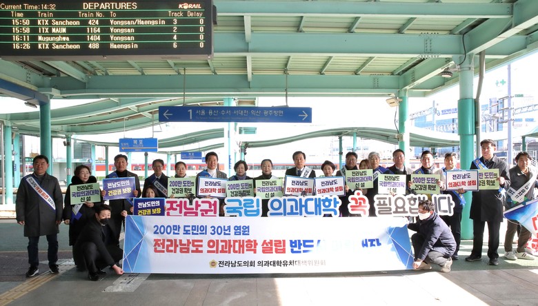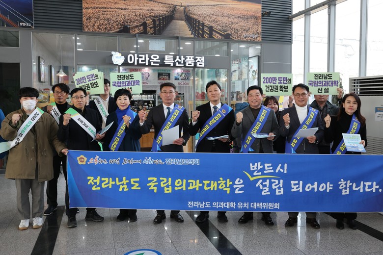 서동욱 전남도의회 의장과 최선국·신민호 공동위원장을 비롯한 도의원들은 “전남은 전국 시·도 중 유일하게 의과대학이 없다. 의과대학이 있어야만 상급종합병원이 생기고, 상급종합병원이 있어야만 건강 불평등 문제를 해결할 수 있다”고 귀성객에게 호소하면서 “200만 도민의 염원인 전남 의과대학 신설이 확정될 때까지 총력을 기울이겠다”고 밝혔다.