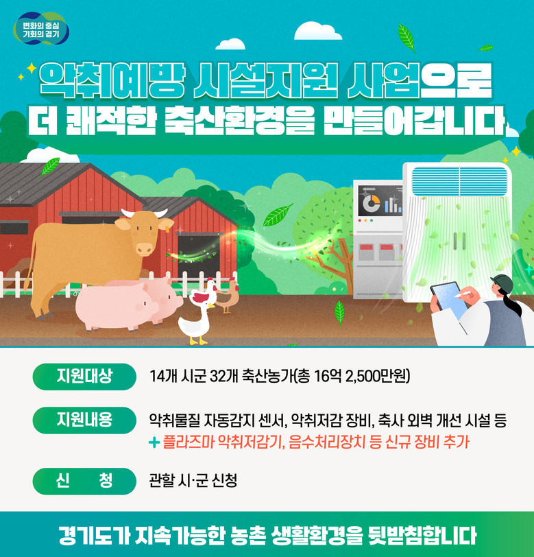 신종광 경기도 축산정책과장은 “축산악취 문제는 축산농가와 지역주민이 함께 살아가기 위해 해결해야 할 필수 과제”라며 “악취 예방 시설 지원 품목 확대를 통해 축산농가의 환경 관리 역량을 높이고, 주민과 상생하는 지속가능한 축산환경을 조성해 나가겠다”고 말했다.