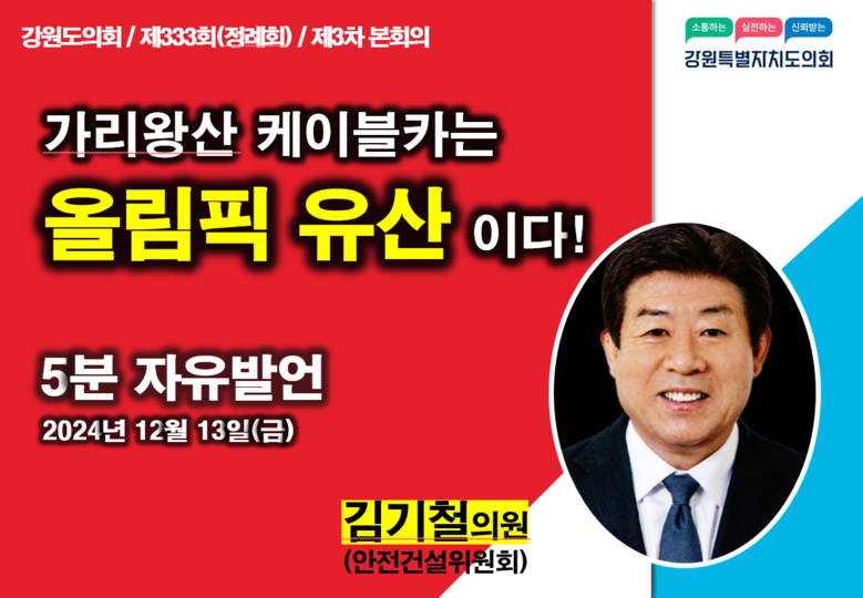 [강원도 세계타임즈=김민석 기자] 김기철 강원특별자치도의원(안전건설위,정선)은 12월 13일(금) 실시된 ‘제333회 정례회 제3차 본회의 5분자유발언’에서 ‘가리왕산 곤돌라는 올림픽 유산이다!’라는 주제로 가리왕산 곤돌라 존치와 국가정원 조성을 주장하였다.