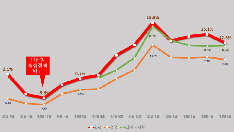 인천시는 지난해 5월부터 상승세로 전환되었으며, 10월부터 두 자릿수의 증가율을 꾸준히 유지하고 있다. 올해 1~5월 혼인 건수도 5,657건으로 전년 동기 대비 2.3% 증가해 결혼과 출산 모두에서 뚜렷한 상승 흐름을 보이고 있다.