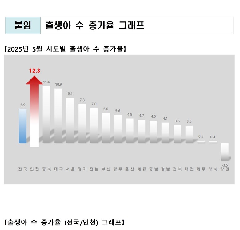 통계청이 7월에 발표한 인구동향에 따르면, 올해 1월부터 5월까지 인천시의 출생아 수는 총 6,868명으로 전년 동기 대비 1,278명이 증가해 12.3%의 높은 성장률을 기록했다. 이는 전국 평균 6.9%를 크게 상회하는 수치이며, 충북(11.4%)과 대구(10.9%)가 그 뒤를 이었다.