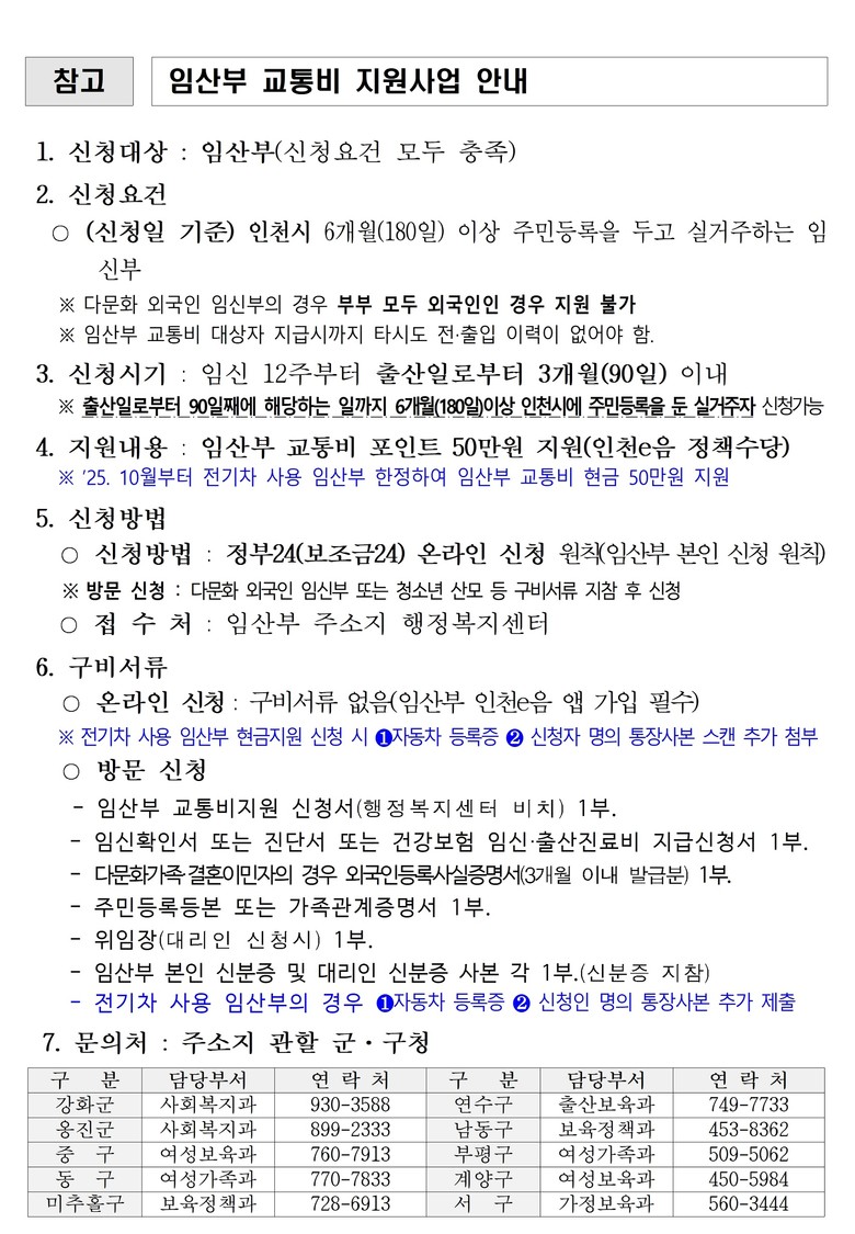 자세한 내용은 인천광역시 및 군·구청 누리집, 정부24 누리집에서 ‘임산부 교통비’를 검색해 확인할 수 있다.