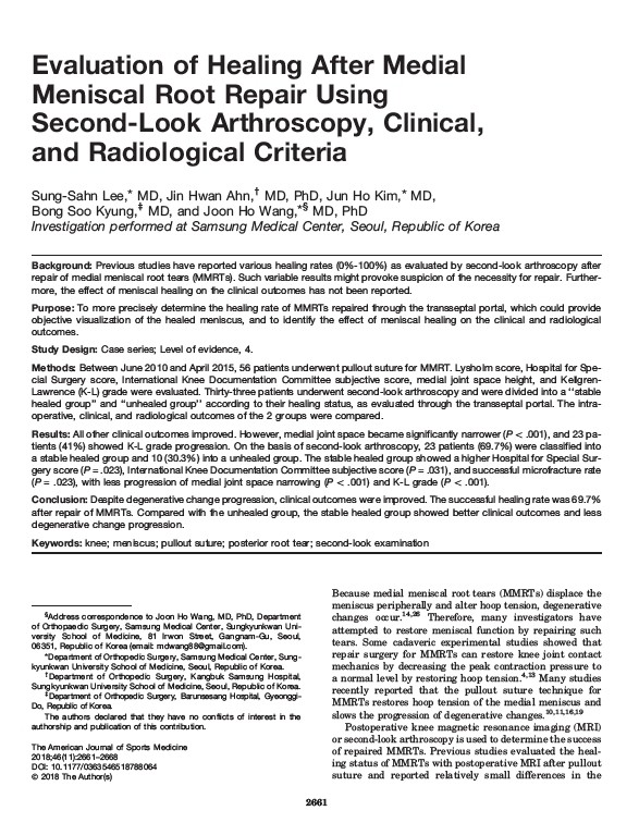SCI급 국제 학술지 ‘The American Journal of Sports Medicine’ 등재이번 연구 논문은 무릎 관절염의 대표 원인으로 꼽히는 반월상 연골판 후각부 파열 치료법인 연골판 봉합술에 대한 연구로, 수술 후 환자의 예후를 수치화하여 분석한 결과를 토대로 환자 유형에 따른 가장 적절한 치료법에 대한 기준을 제시했다는 평가를 받았다.