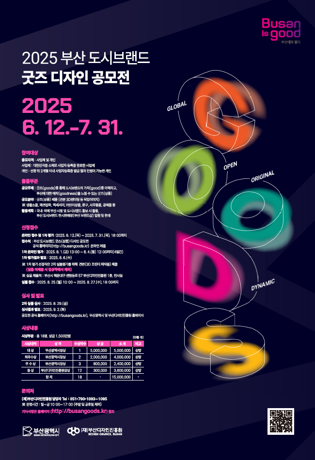 한편, 공모전에 대한 자세한 내용은 공모전 공식 누리집(busangoods.kr) 또는 시 누리집 고시공고(www.busan.go.kr/nbgosi), 진흥원 누리집(www.dcb.or.kr)에서 확인할 수 있다.