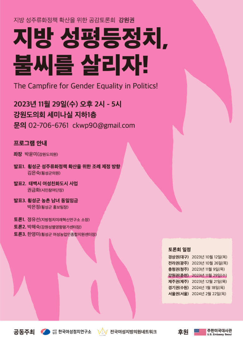 -2023년 11월 29일(수) 14시~17시 / 강원도의회 세미나실 (지하1층)- [강원도 세계타임즈=김민석 기자] 2023년 11월 29일(수) 강원특별자치도의회 세미나실에서 “지방 성평등정치, 불씨를 살리자!”는 주제로 강원권 성주류화정책 확산을 위한 공감토론회가 열린다.