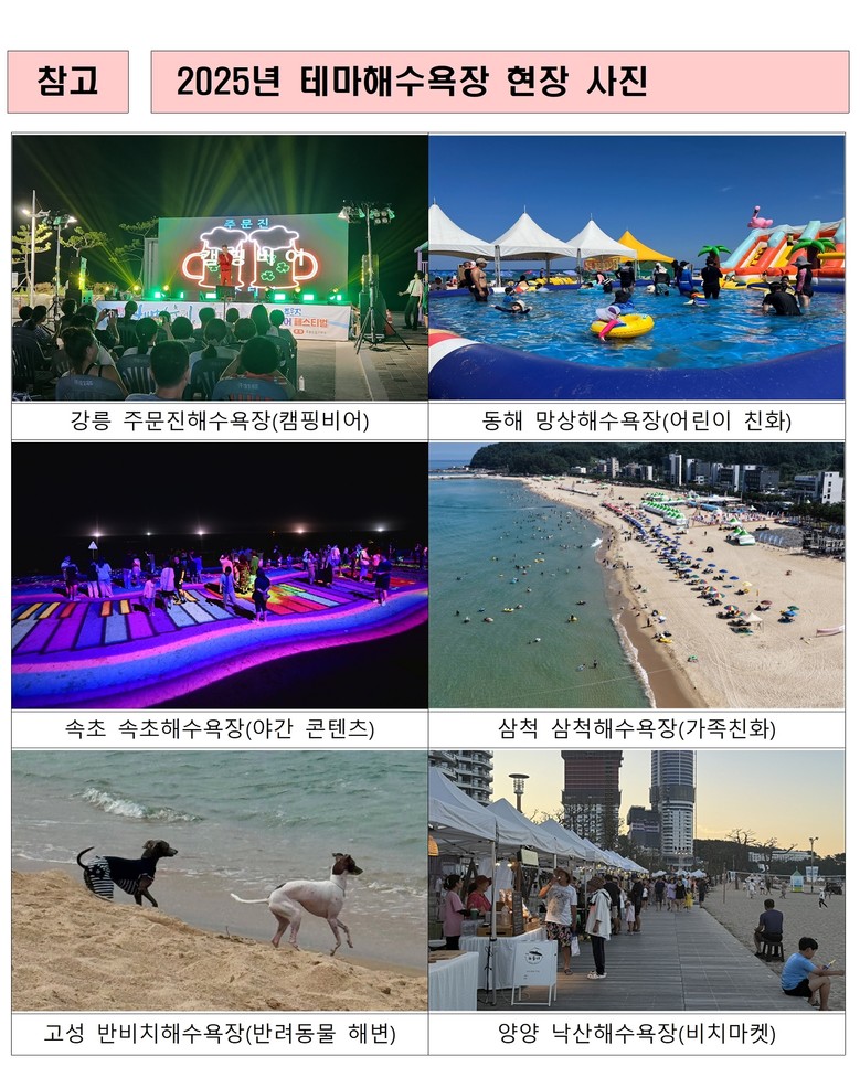 ○ (강릉) 주문진 캠핑비어 해수욕장, (동해) 망상 어린이 친화 해수욕장, (속초) 야간 콘텐츠 해수욕장, (삼척) 가족 친화 해수욕장, (고성) 반비치 반려동물 해수욕장, (양양) 낙산 해수욕장 비치마켓