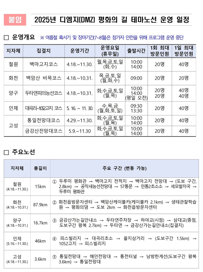 비무장지대(DMZ) 및 민간인통제선 내 지역의 생태.역사.문화 자원을 따라 조성된 ‘디엠지(DMZ) 평화의길 테마노선’은 올해 4월 18일 개방됐으며, 혹서기(7~8월) 일시 중단 후 9월 초 다시 개방하여 11월 30일까지 운영된다.