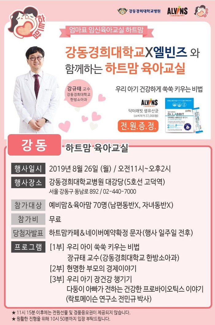 이번 건강강좌는 하트맘 부모학교 카페(https://cafe.naver.com/smallheartmom)에서 사전 신청을 통해 참여할 수 있다. 사전 건강강좌 신청자 전원에게는 닥터래빗 생유산균을 증정한다.
