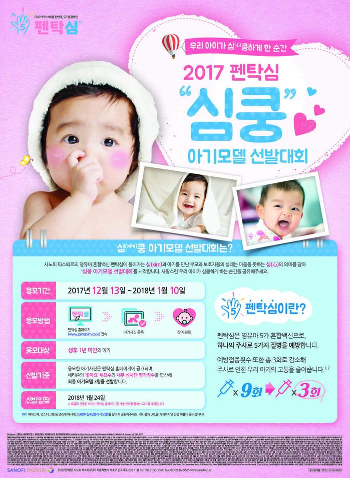 글로벌 백신 기업 사노피 파스퇴르㈜ (대표 밥티스트 드 클라랑스, Baptiste de Clarens, 이하 “사노피 파스퇴르”)는 5가 혼합백신 ‘펜탁심 주(Pentaxim, 이하 “펜탁심”)’의 공식 홈페이지 개설을 기념해 ‘심(xim)쿵 아기모델 선발대회’를 2017년 12월 13일부터 2018년 1월 10일까지 약 4주 간 진행한다고 밝혔다.