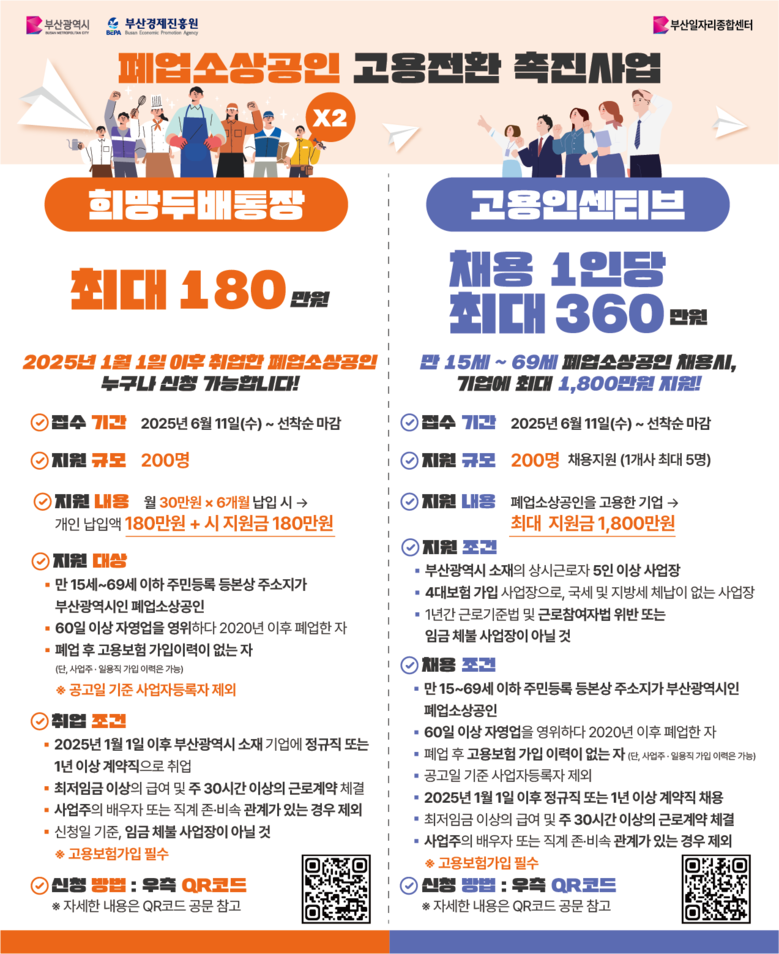 시는 올해 제1회 추경을 통해 사업 예산을 확보해 진흥원의 ‘부산일자리종합센터’ 주관 아래, 오늘(11일)부터 사업을 본격 추진한다. 폐업소상공인 중 올해(2025년) 1월 이후 취업자 및 폐업소상공인을 채용한 고용주가 신청 대상이며 사업별 주요 내용은 다음과 같다.