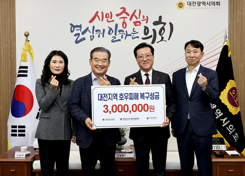 [대전 세계타임즈=이채봉 기자] 대전시의회 (의장 조원휘)는 지난 7월 기성동 지역 등에서 발생한 호우피해민을 지원하기 위해 대한민국시도의회의장협의회에서 지원받은 재난구호금 300만원을 대전사회복지공동모금회에 기탁했다.
