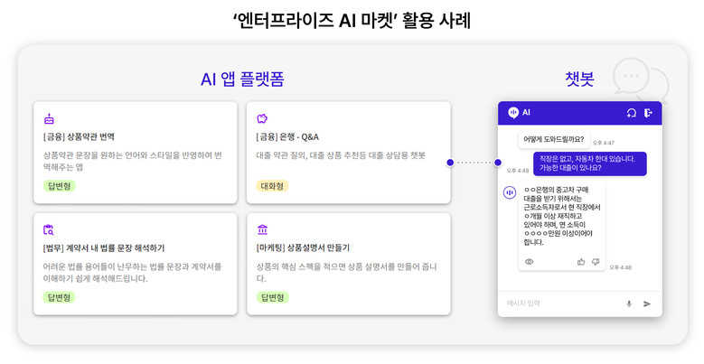 ‘엔터프라이즈 AI 마켓’은 기업 관리자가 별도의 코딩 지식 없이 간단한 명령어를 입력해 생성형 AI 앱을 제작하면, 자사의 전 구성원이 해당 앱을 활용해 챗봇 등으로 답변을 받을 수 있는 기업형 AI 서비스이다. 해당 기업 고객만을 위한 특화형 플랫폼 형태로 운영된다.