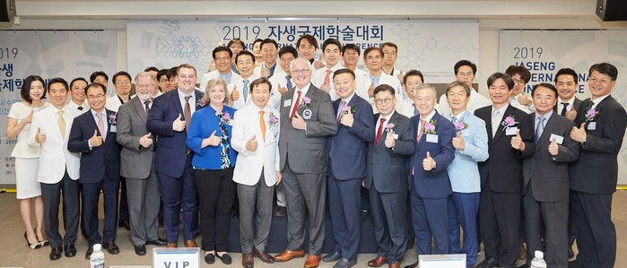 | ▲자생의료재단 신준식 명예이사장(가운데 왼쪽)과 미국 오스테오페틱의학협회 윌리엄 메이요 회장(가운데 오른쪽)을 비롯한 ‘2019 자생국제학술대회’ 관계자들이 폐회식을 마치고 기념촬영을 하고 있다. |