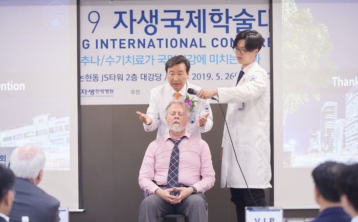 | ▲‘2019 자생국제학술대회’에서 자생의료재단 신준식 명예이사장이 연자로 나서 추나요법을 시연하고 있다. |
