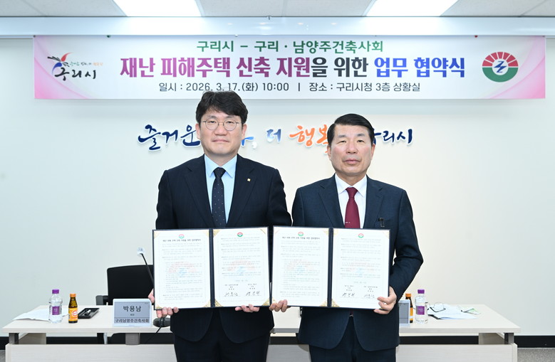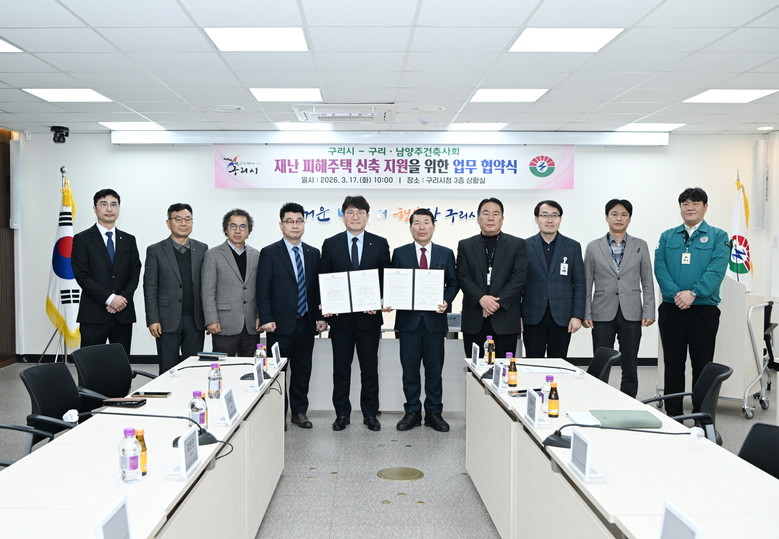 [구리시 세계타임즈=송민수 기자] 구리시(시장 백경현)는 지난 17일 구리·남양주건축사회(회장 박용남)와 재난 피해 주민의 신속한 주거 안정을 지원하기 위한 「재난 피해 주택 신축지원 업무협약」을 체결했다.